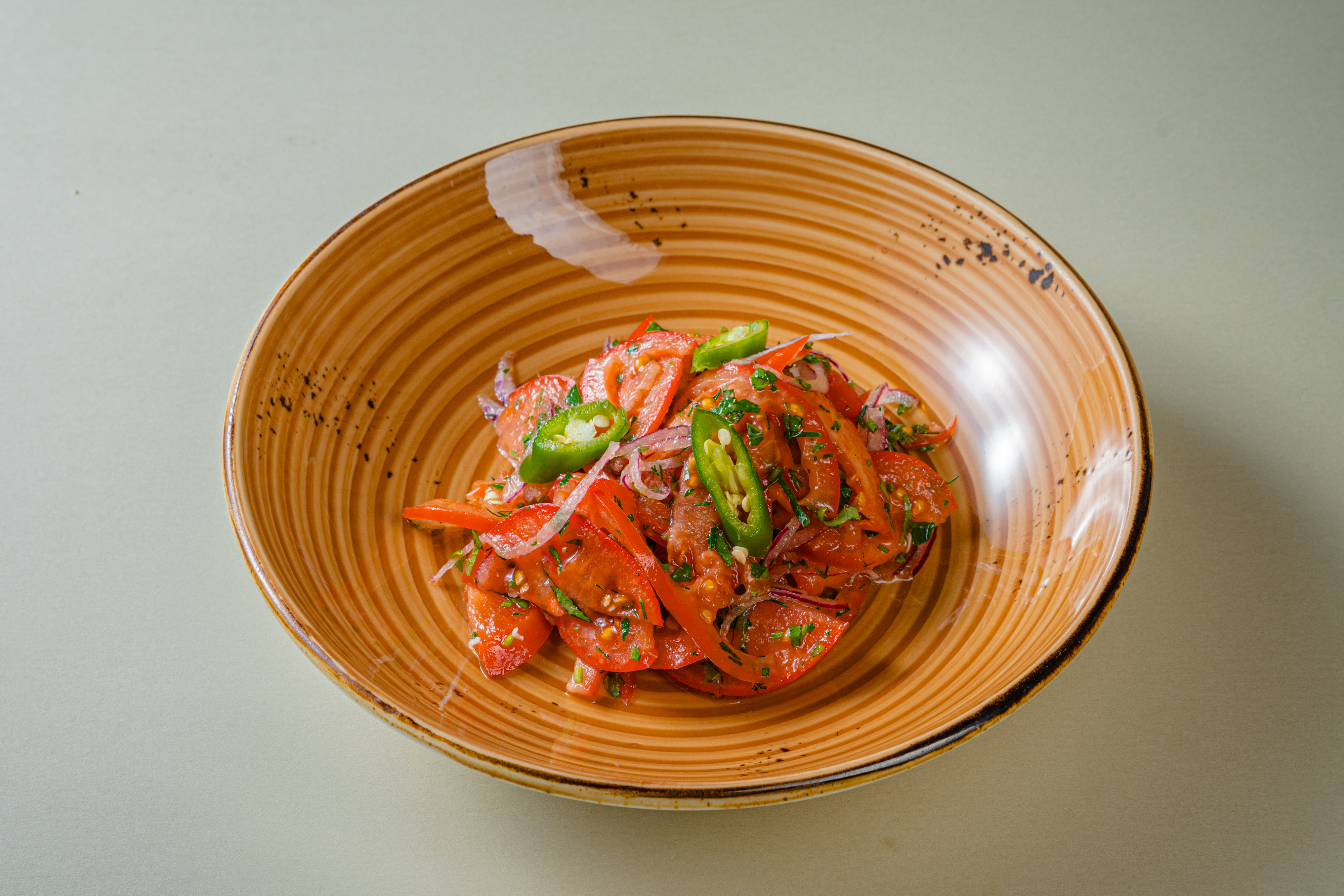 Традиционный салат из сладких Узбекских помидоров. С добавлением красного репчатого лука, красного острого перца, свежей зелени и листьев базилика.