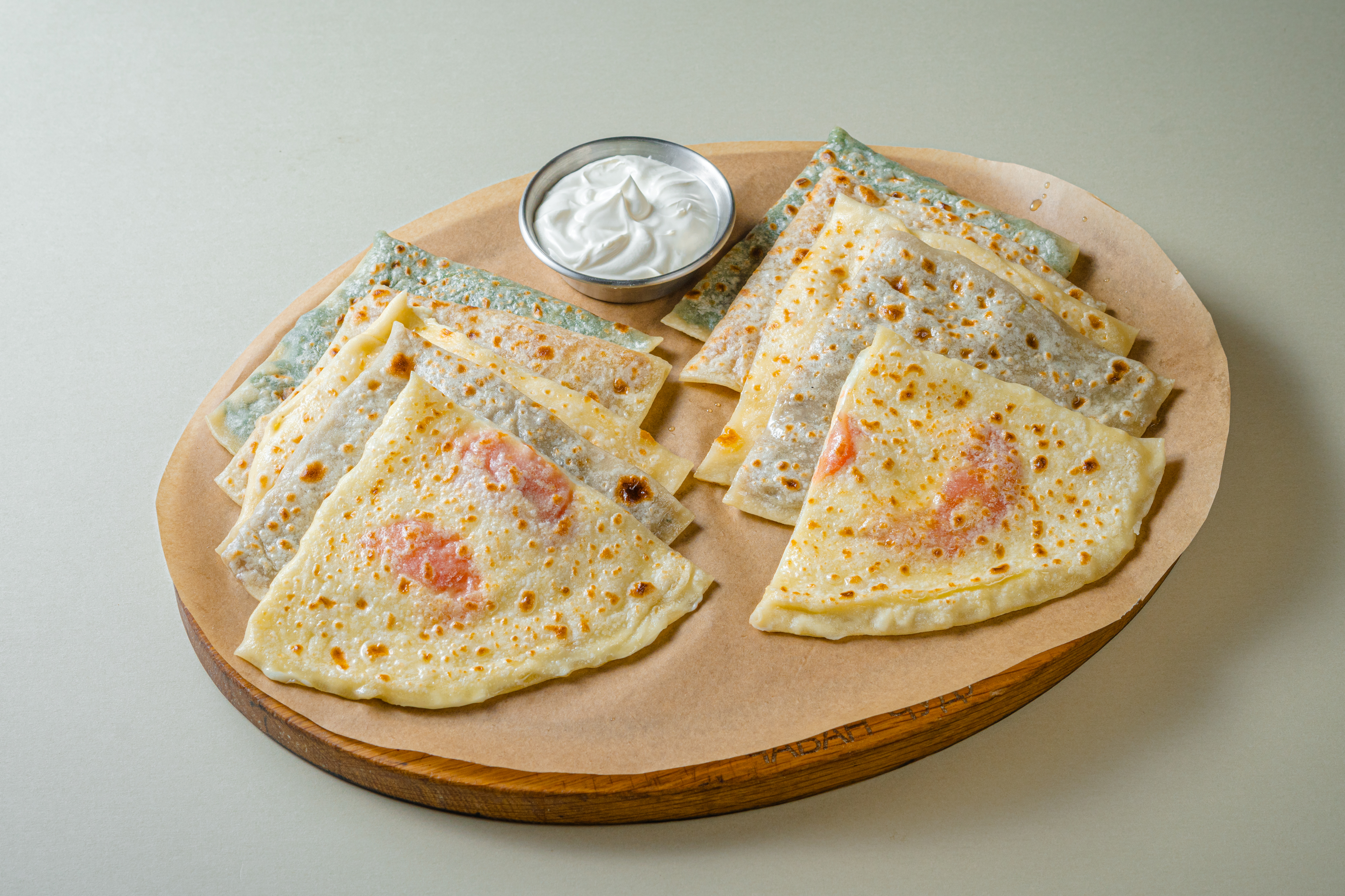 Чуду с тыквой; с зеленью; с мясом; с творогом; с сыром и помидорами. Подаётся со сметаной.