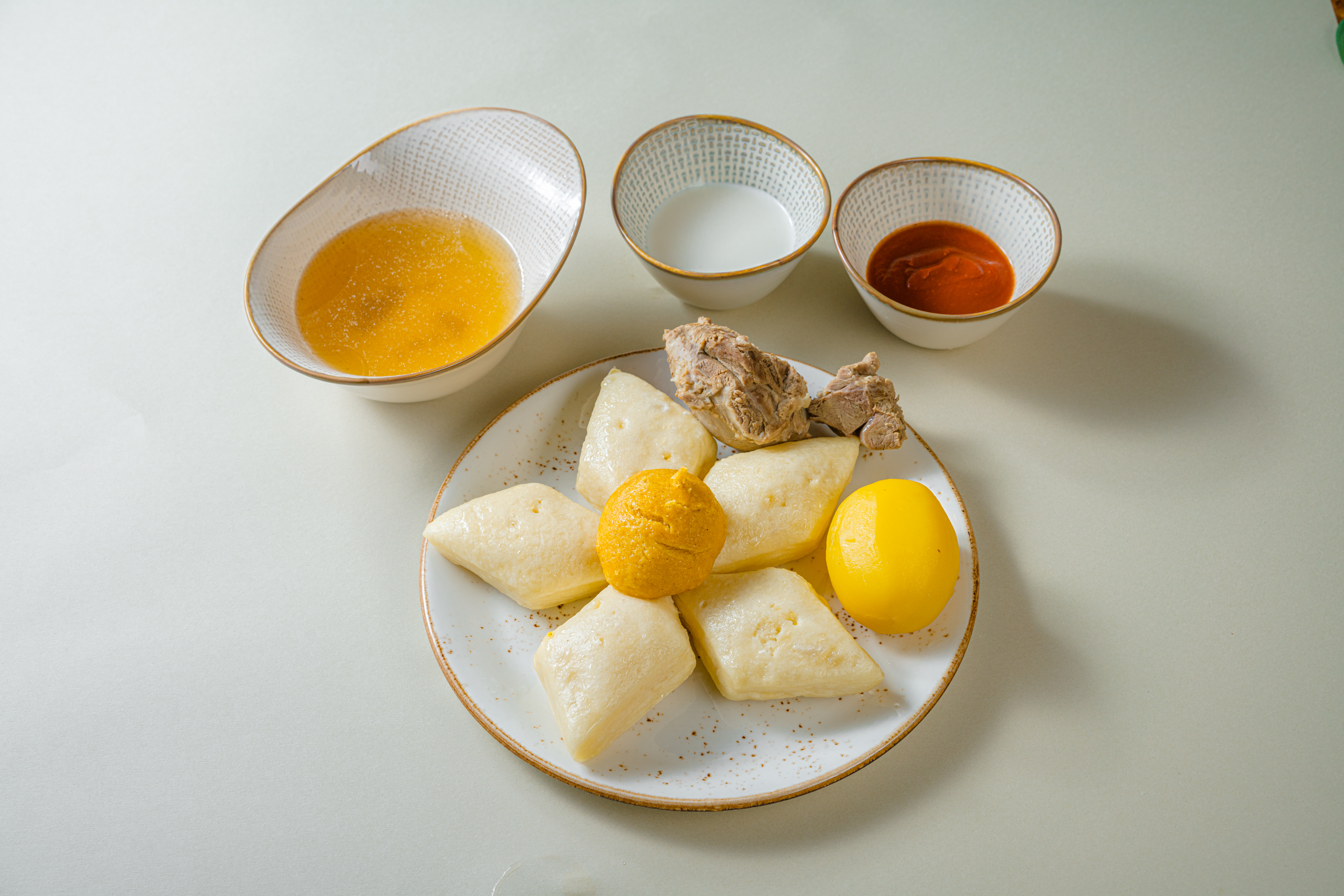 Это пышное кефирное тесто, сваренное в бульоне, подается с мясом на выбор, двумя соусами и наваристым говяжьим бульоном