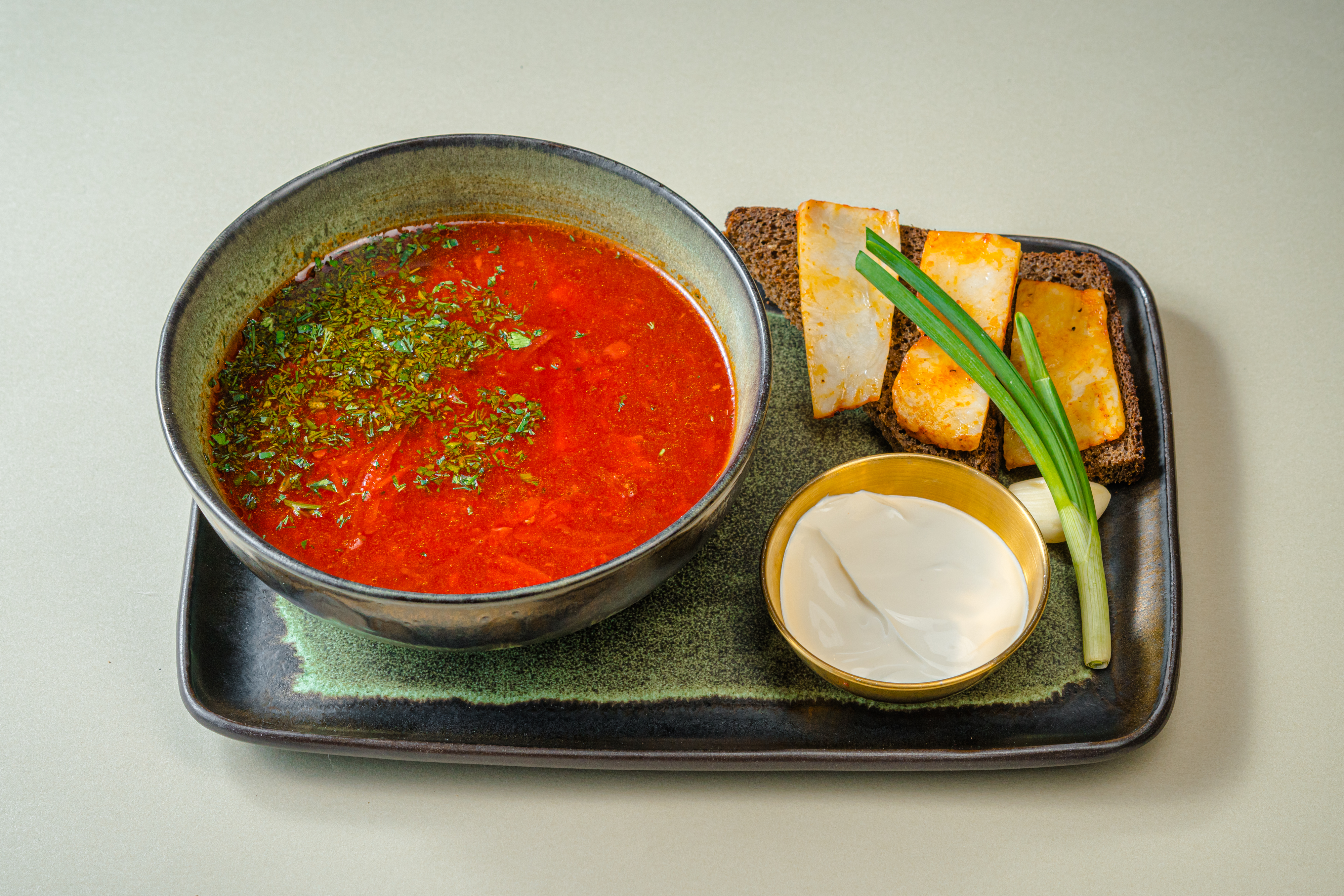 Наваристый густой суп из нежной говядины, кочанной капусты, свеклы, картофеля и классической пассеровки из лука, моркови и томатной пасты, подается со сметаной,курдюком и бородинским хлебом