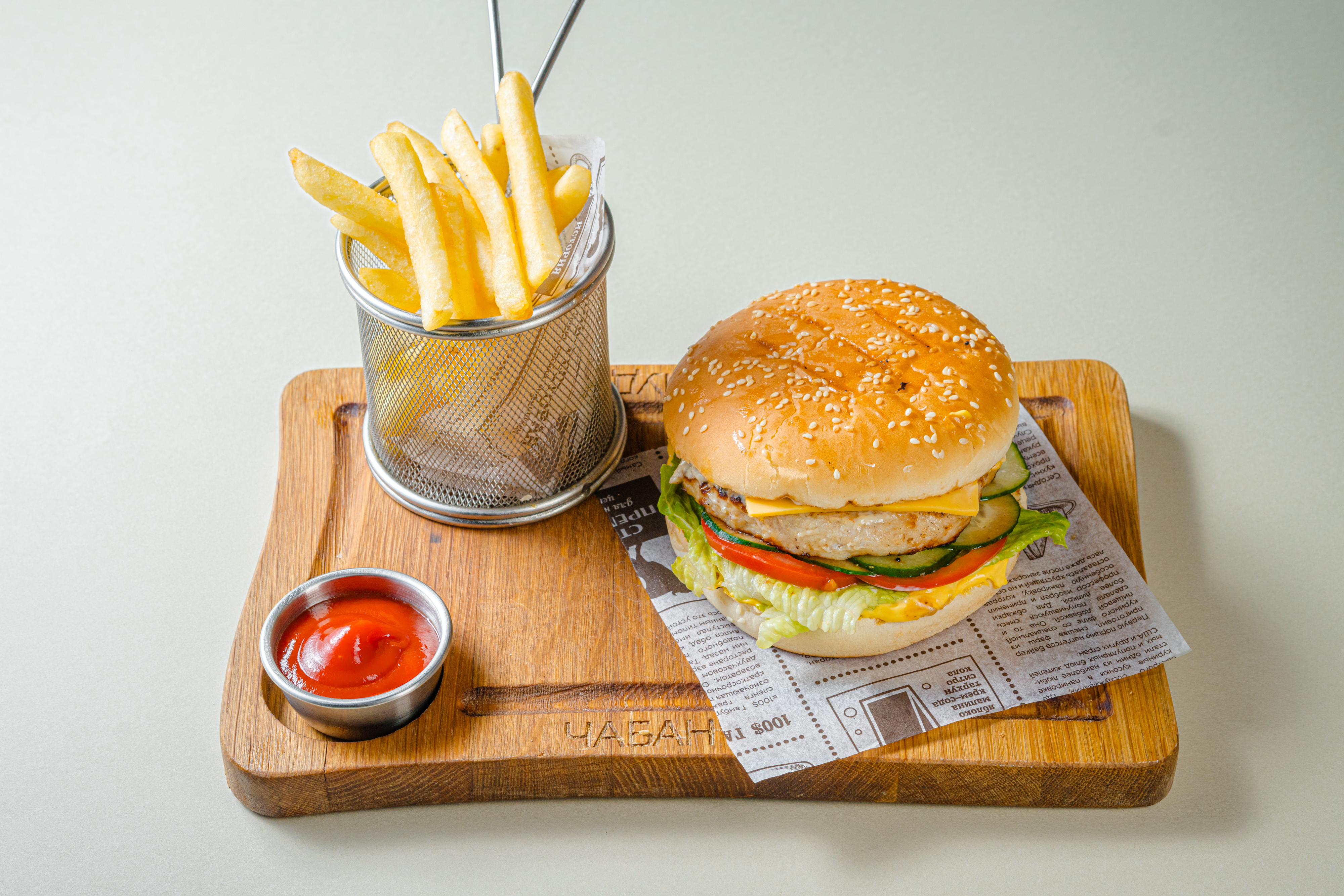 Фирменный бургер с сочной куриной котлетой обжаренной на углях, булочками с кунжутом, листьями Романо и Айсберга. С добавлением свежих огурцов, сладких помидор, сыра чеддер и фирменным соусом. Подаётся с картофелем фри.