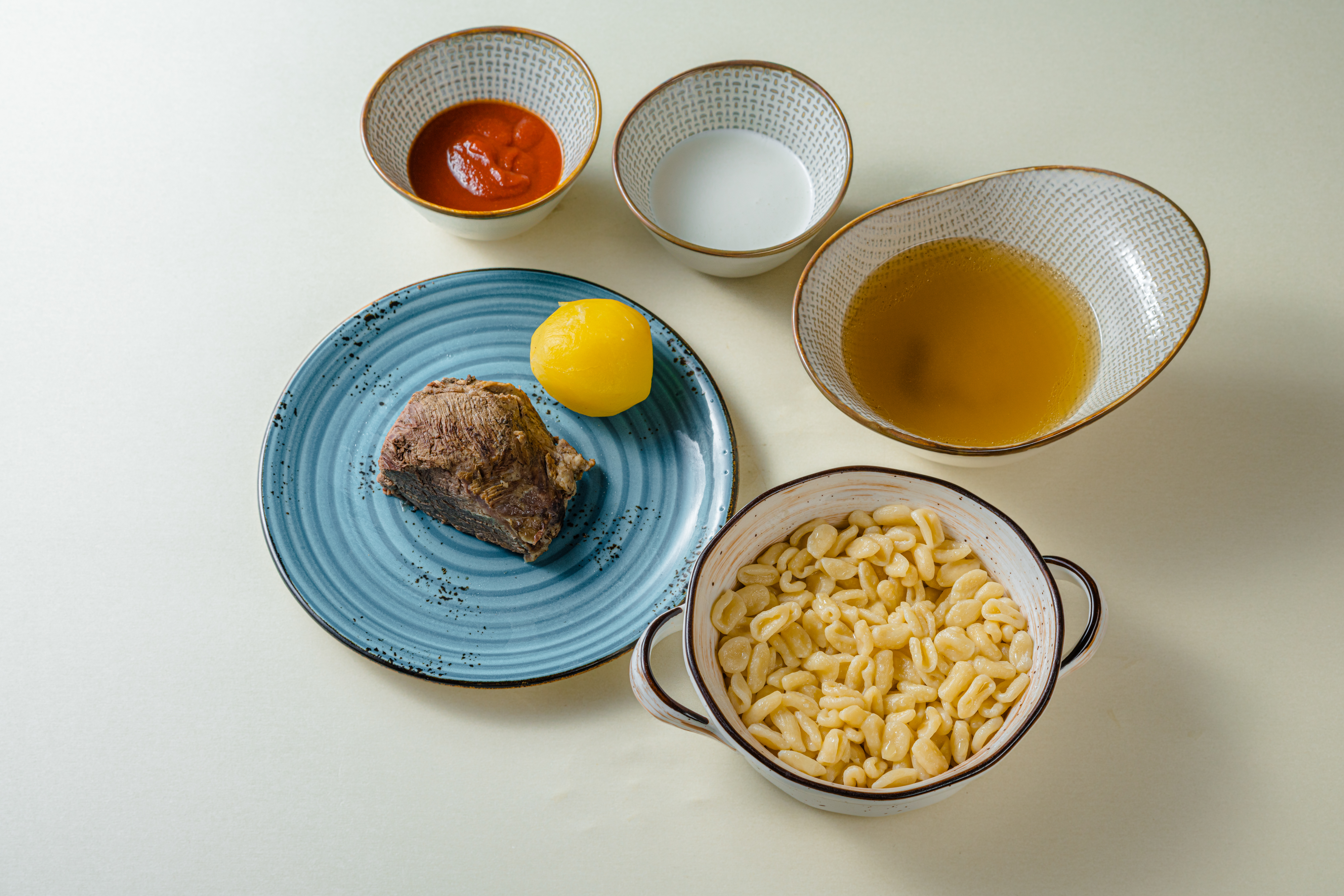 Это маленькие клёцки из пресного теста, приготовленные в бульоне, подается с мясом на выбор, двумя соусами и наваристым говяжьим бульоном