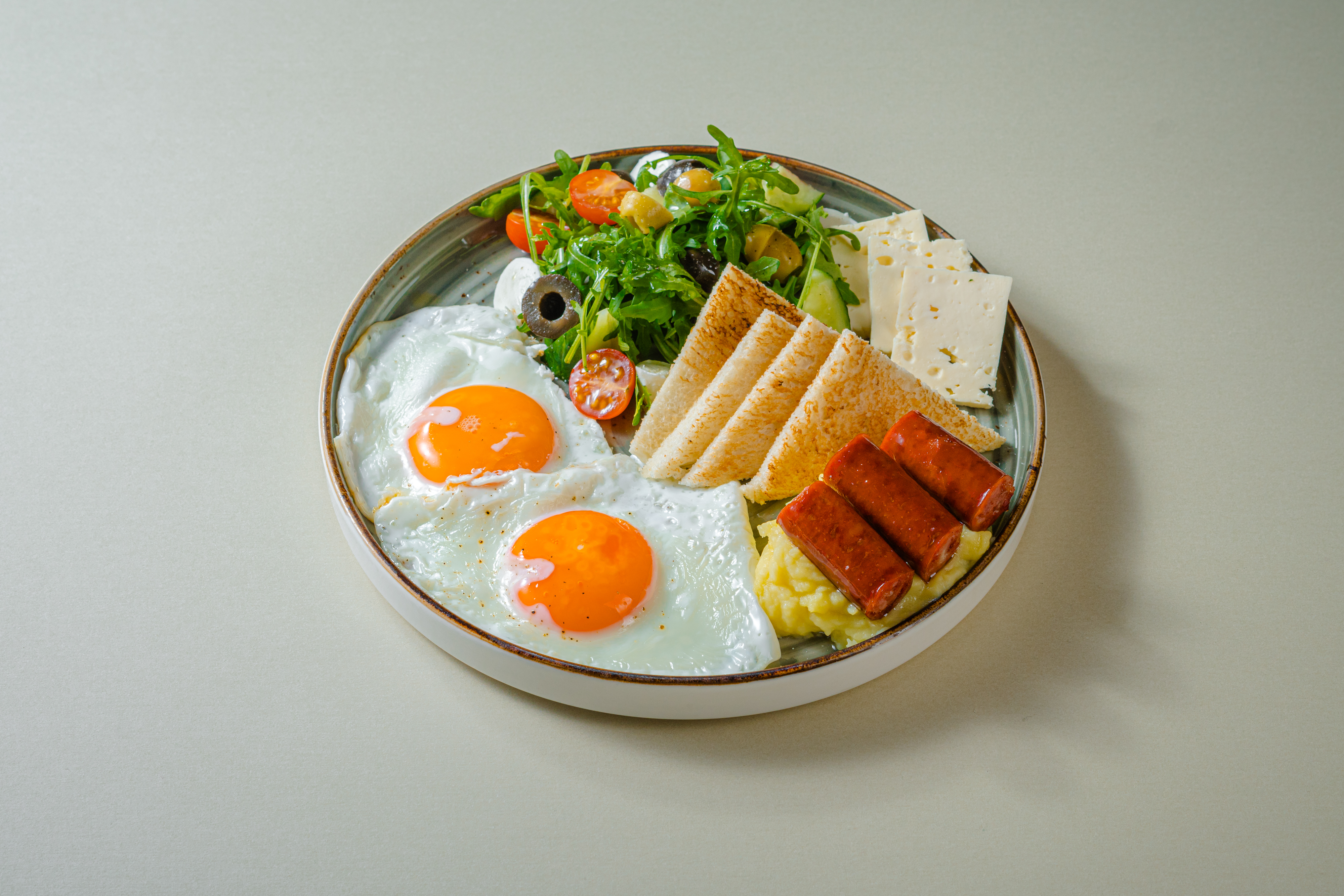 Яичница глазунья с обжаренными охотничьими колбасками, хрустящим тостом, маслинами и оливками, свежими огурцами, сладкими томатами Черри, нежно-воздушным пюре и домашним сыром.