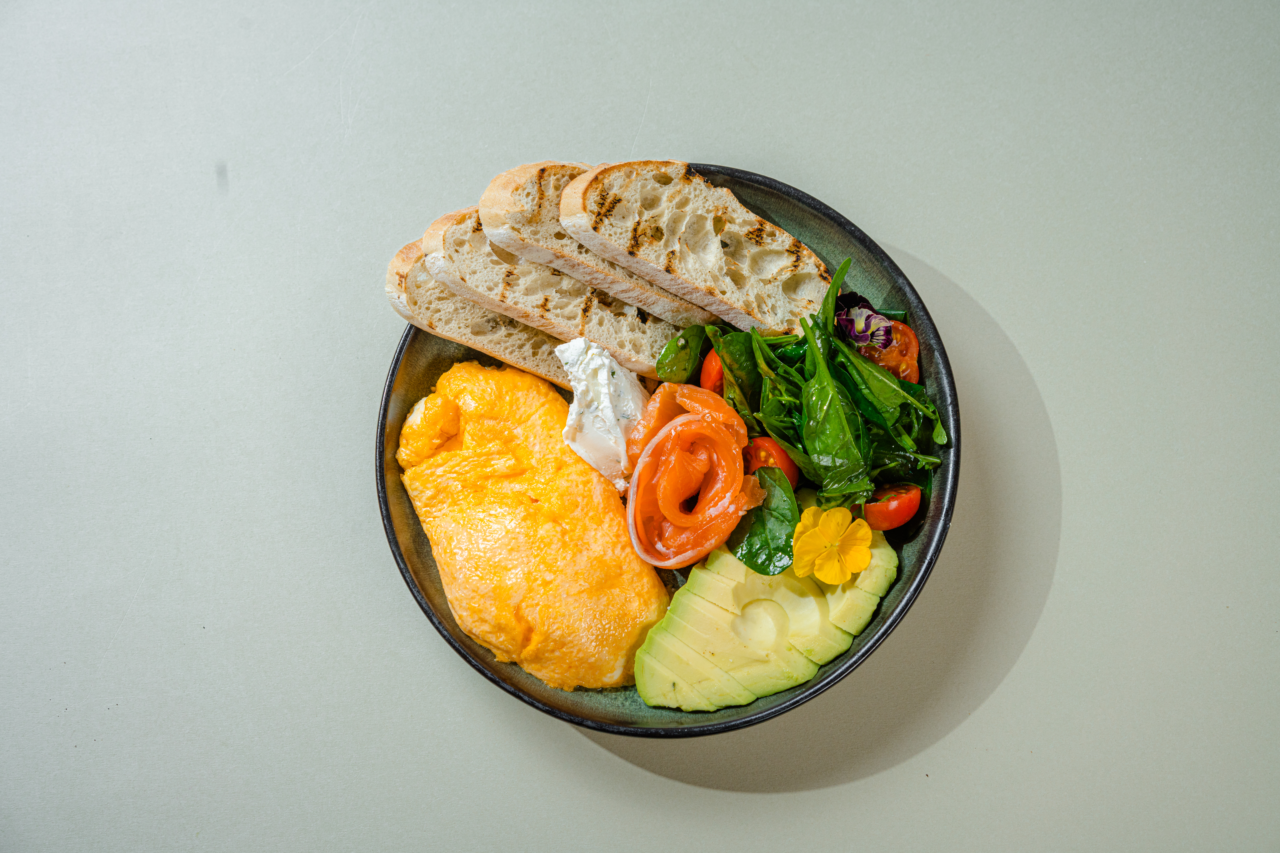 Горячая Чиабатта с норвежским лососем, омлетом скрэмбл, авокадо, рукколой и нежным творожным сыром.