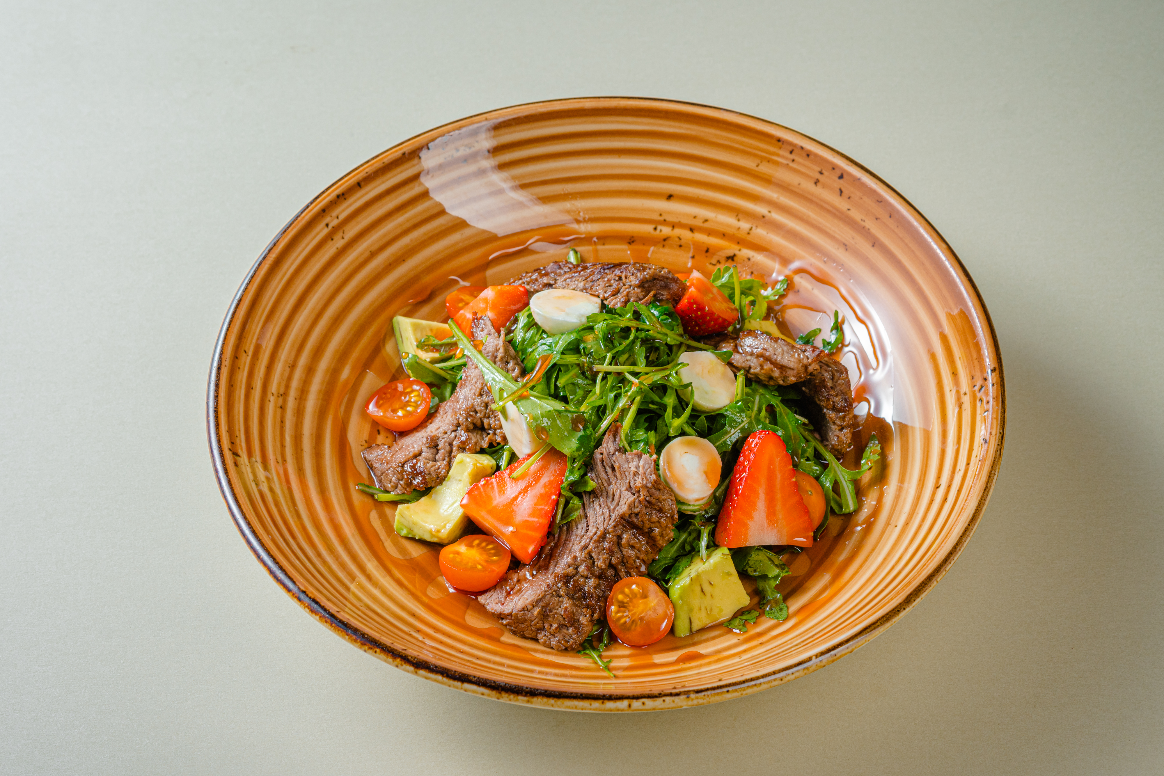 Тёплый салат из рукколы и обжаренного Бон филе. С добавлением сыра моцарелла, авокадо, томатов Черри, освежающей клубники и экзотического соуса.
