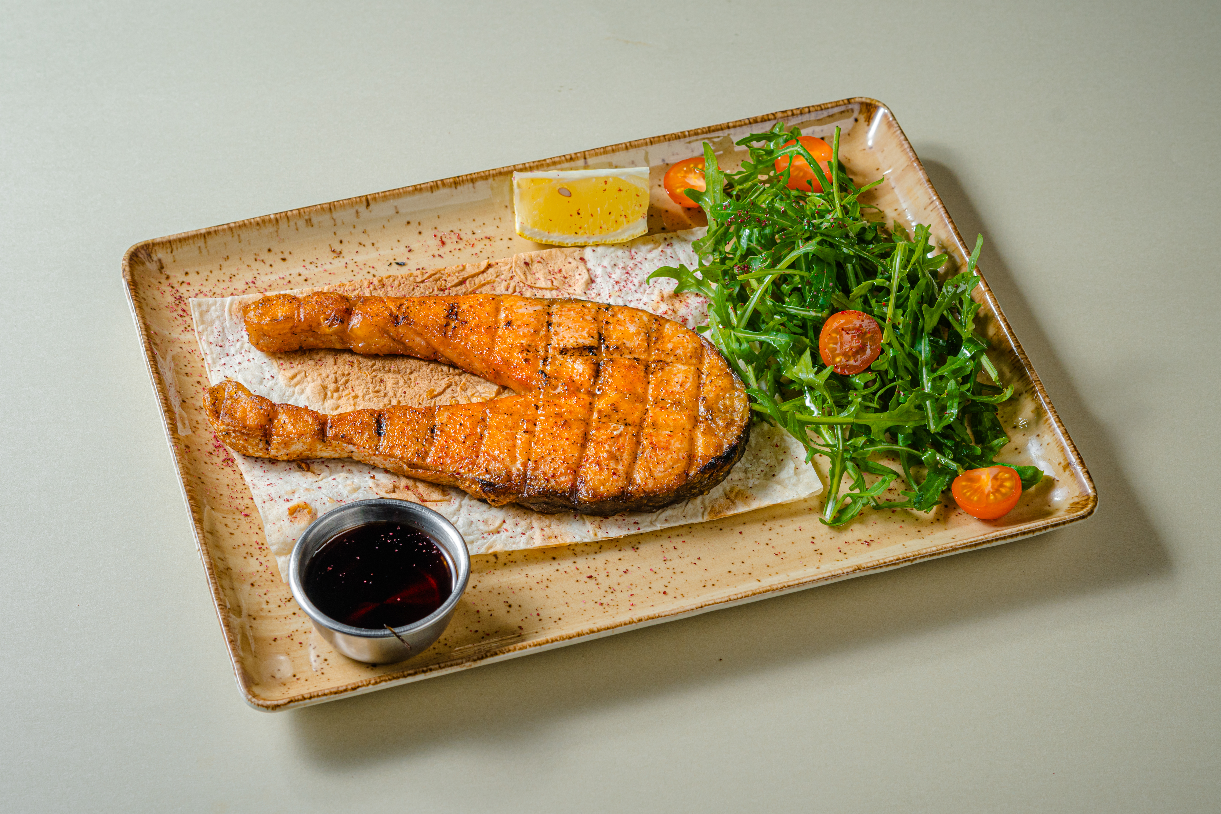 Стейк сёмги, приготовленный на углях, подаётся с гранатовым соусом, долькой лимона и мини-салатом из рукколы и томатов Черри.
